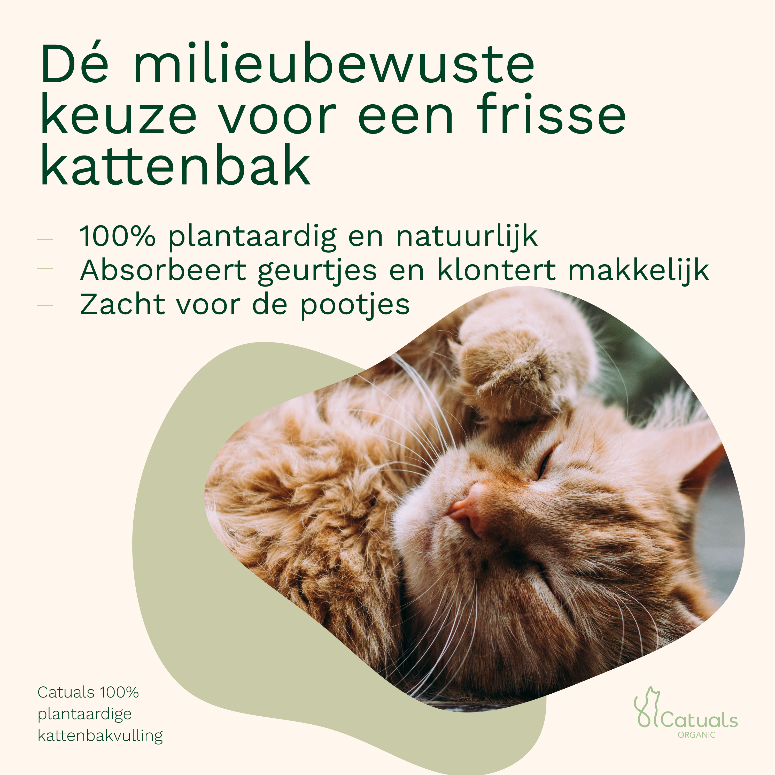 De Catuals Klontvormende Kattenbakvulling is gemaakt van duurzame plantaardige ingrediënten en ontwikkeld met zowel jouw kat als het milieu in gedachten. Zacht voor de pootjes, vriendelijk voor de natuur en verrassend effectief.